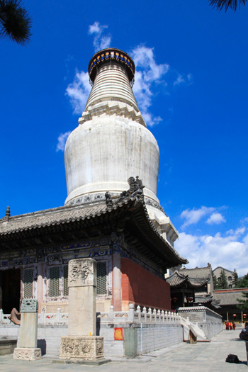 塔全稱為釋迦牟尼舍利塔,俗稱大白塔。塔身撥地而起凌空高聳,在五臺山群寺簇擁之下頗為壯觀,人們把它做為五臺山的標志。此塔通高七十五點三米,環(huán)周八十三點三米。塔基為正方形,塔身狀如藻瓶,粗細相間,方圓搭配,造型優(yōu)美。塔頂蓋銅板八塊成圓形,按乾、坎、艮、震、巽、離、坤、兌等八卦地位安置。塔頂中裝銅頂一枚,高約五米,覆盤二十一米多,飾有垂檐三十六塊,長兩米多;每塊垂檐底端掛風鐘三個,連同塔腰風鐘在內(nèi),全塔共有二百五十二個。風歡鈴動,叮鐺作響。