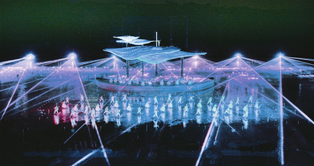 在這場演出中,最令人驚嘆的當(dāng)數(shù)傳統(tǒng)文化與現(xiàn)代科技的完美融合?!度鐗魰x陽》演出設(shè)備島造型由大量不銹鋼鋼管經(jīng)過設(shè)計(jì)、再加工拼接而成,整體形成“山”的造型,好似坐落于湖中心的小島。面積高達(dá)182米×82米的全水下噴泉矩陣、2000多束璀璨燈光,配合前方的直流、對拱、扇形水幕,連同后方80米×19米網(wǎng)幕形成的視覺矩陣投影,展現(xiàn)出宏大的山景古城畫面。這些畫面栩栩如生,將晉陽古城的歷史變遷、文化傳承一一展現(xiàn)在觀眾眼前,讓人仿佛置身于歷史的長河之中,親身感受著晉陽的興衰榮辱。