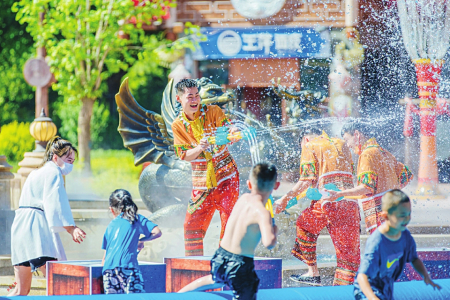 樂園精心打造的充滿濃郁“傣式”風(fēng)情的潑水活動(dòng),身著傣族特色服飾的NPC們組成巡游隊(duì)伍,手持水盆、水槍,與沿途游客熱情互動(dòng)。