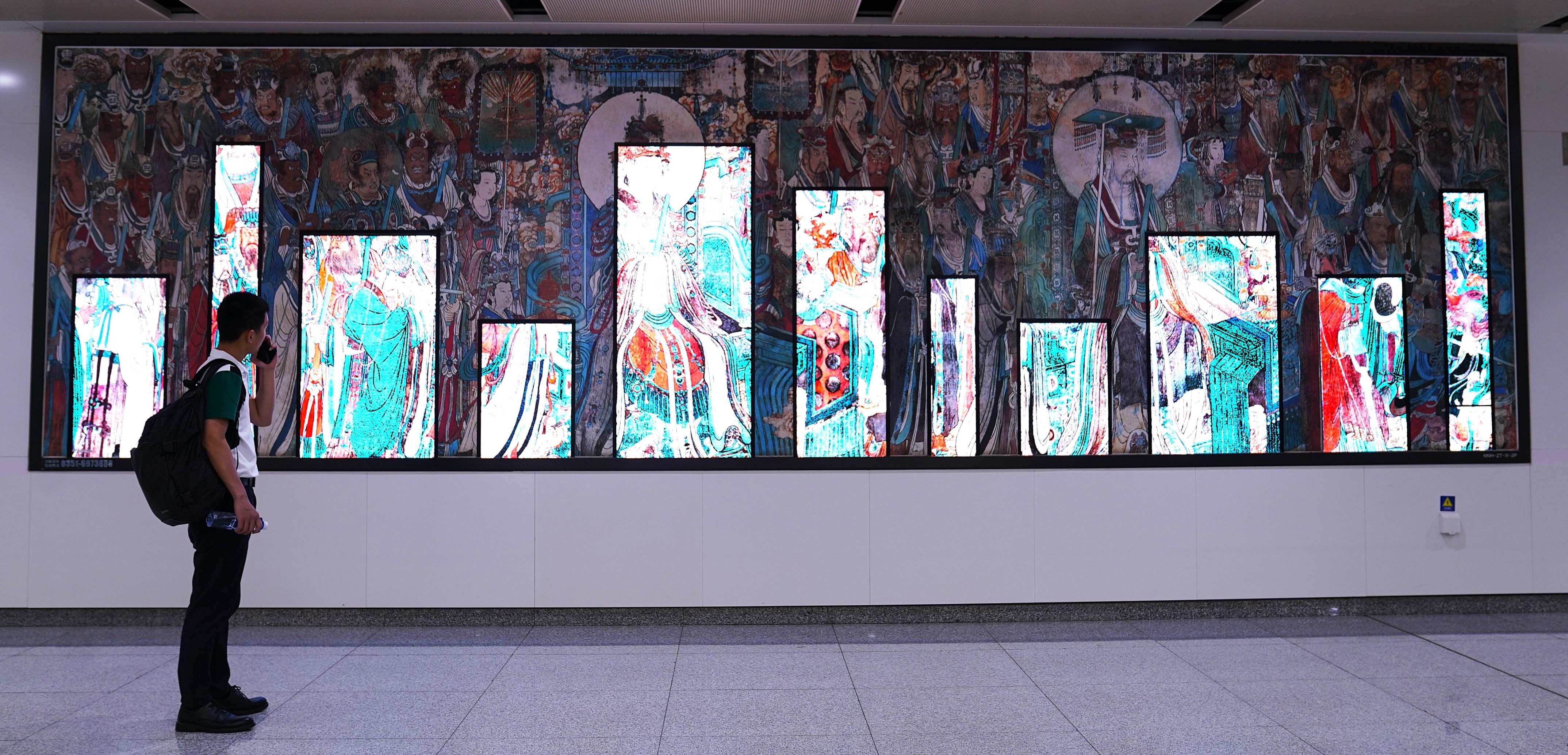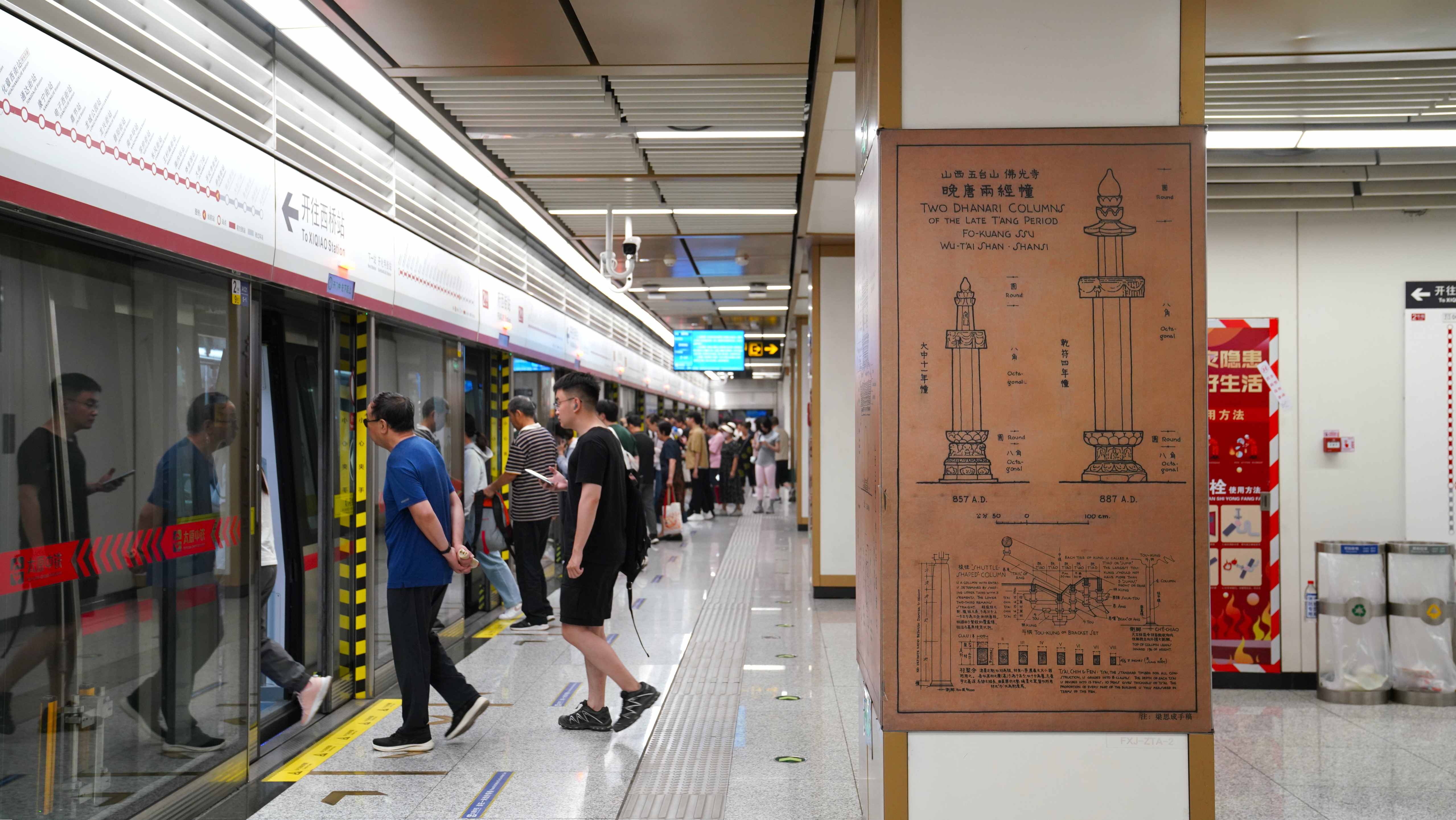 連永樂(lè)宮壁畫的絢麗、云岡石窟大佛的莊嚴(yán)、應(yīng)縣木塔的精巧,都被藝術(shù)復(fù)刻在站廳里——等車的間隙,有人會(huì)盯著壁畫上的飛天出神,有人會(huì)摸著梁思成筆下的古塔紋路發(fā)呆,匆忙的通勤路,忽然就多了份文化的滋養(yǎng)。