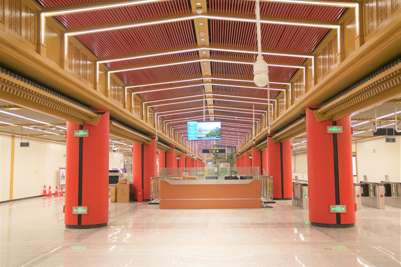 不止于此,太原地鐵2號(hào)線每一個(gè)站點(diǎn),都隱藏著設(shè)計(jì)師的巧思妙想。北大街站天藍(lán)色的線條流暢得像條河,串著山西從古至今的故事,也串著山西與世界的相遇;府西街站的屋脊造型,是從山西古建中“搬”來(lái)的,翹角的弧度里藏著匠人的心思;晉陽(yáng)街站的墻面印著晉商大院的磚雕,一磚一瓦都透著當(dāng)年晉商走西口的豪邁;龍城大街站的屋檐,分明是五臺(tái)山延慶寺大殿的模樣,抬頭看時(shí),仿佛能聽見(jiàn)古寺的鐘聲。