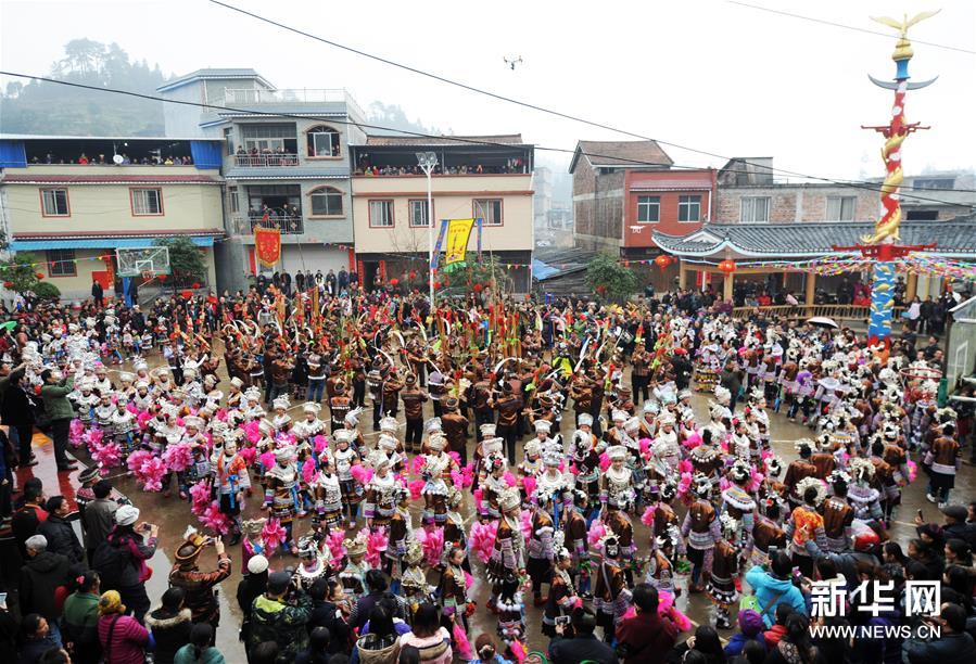 2月7日,廣西融水苗族自治縣安太鄉(xiāng)苗族群眾開(kāi)展傳統(tǒng)的“打同年”民俗活動(dòng)。當(dāng)?shù)財(cái)?shù)百名苗族同胞與游客們歡聚一堂,一起開(kāi)展對(duì)歌、蘆笙踩堂、文藝晚會(huì)等活動(dòng),歡慶新春佳節(jié)。 “打同年”是融水苗族村寨的一種民俗,即友好村寨之間的拜年聯(lián)歡活動(dòng)。新華社記者 李斌 攝