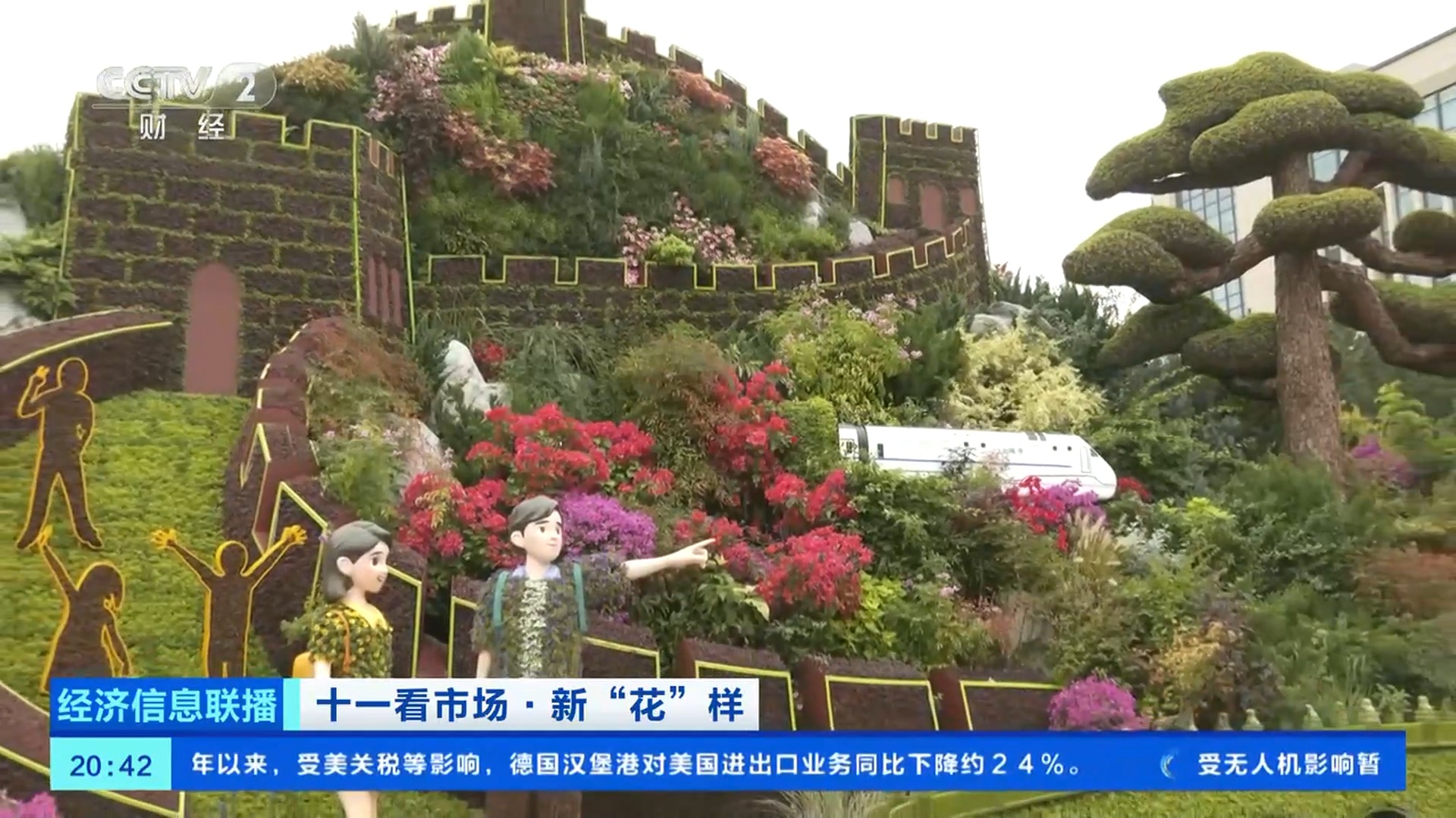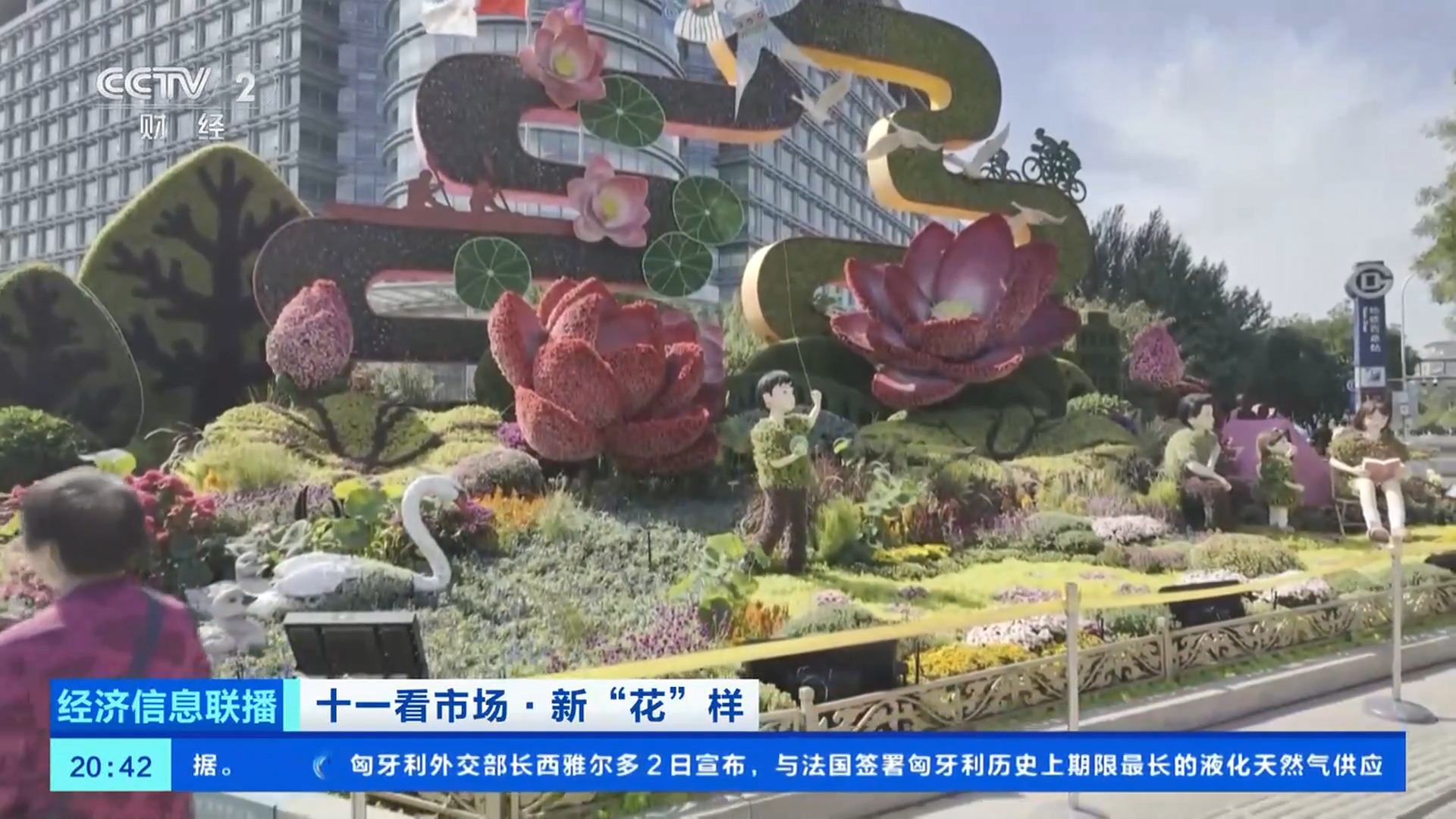 總臺央視記者 王聞聰:今年北京天安門廣場中心花壇的大花籃和長安街沿線的10組立體花壇,都在國慶中秋假期增添了夜間照明設(shè)施,讓夜晚的花壇更加引人注目。北京東單東南角的“黃河贊歌”立體花壇,也被稱為是“會唱歌的花壇”。在花壇上不僅能看到微觀的壺口瀑布、奔騰的駿馬、載歌載舞的人群,還有水霧、音樂等聲光電技術(shù),更加逼真地還原了黃河之水天上來的氣勢。晚上八點,這里仍有大量游客前來拍照打卡。