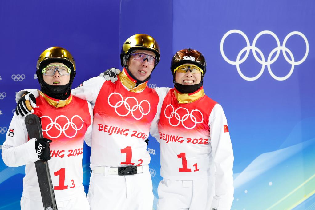 2月10日,中國隊選手賈宗洋(中)、徐夢桃(右)和齊廣璞(左)在自由式滑雪空中技巧混合團(tuán)體比賽后等待成績公布。新華社記者費茂華攝
