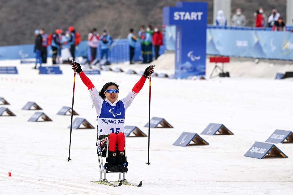 3月9日,中國楊洪瓊獲得北京冬殘奧會(huì)殘奧越野滑雪女子短距離(坐姿)冠軍。新華社記者李博攝