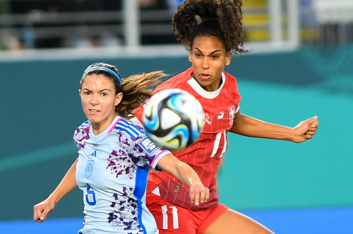 8月5日,女足世界杯八分之一決賽,西班牙隊(duì)以5:1戰(zhàn)勝瑞士隊(duì),圖為西班牙隊(duì)球員艾塔納·邦馬蒂(左)與瑞士隊(duì)球員孔巴·索烏在比賽中拼搶。新華社記者郭磊攝