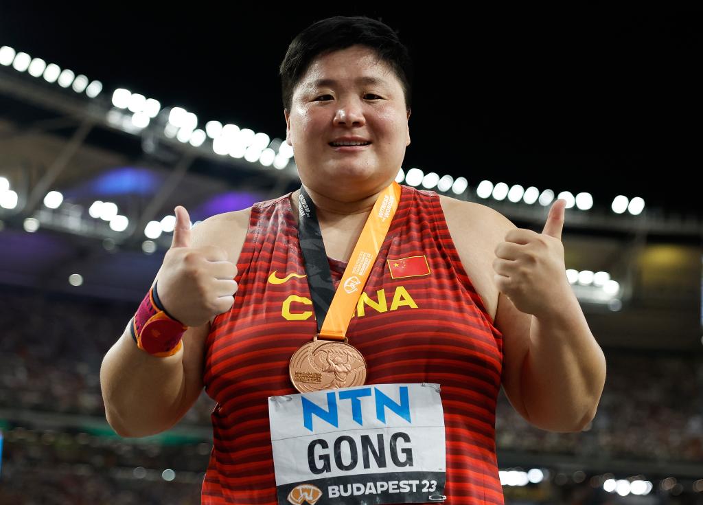 8月26日,中國(guó)選手鞏立姣在決賽后慶祝。當(dāng)日,在匈牙利布達(dá)佩斯舉行的2023世界田徑錦標(biāo)賽女子鉛球決賽中,中國(guó)選手鞏立姣以19米69的成績(jī)獲得季軍。新華社記者王麗莉攝