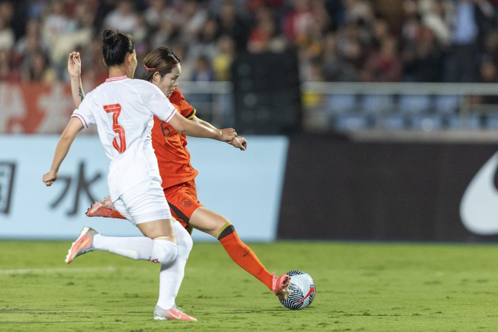 10月29日,中國(guó)隊(duì)球員張馨(右)在比賽中射門。新華社記者 黃偉 攝