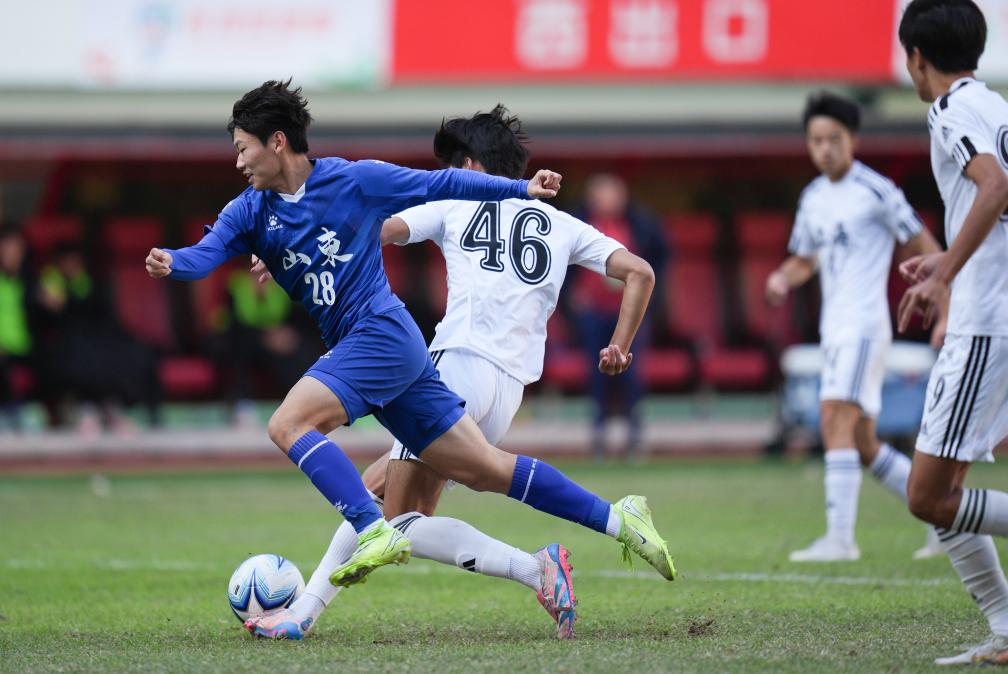 11月27日,山東隊球員陳子涵(左一)在比賽中進攻。當(dāng)日,在第一屆青少年三大球運動會男足決賽中,山東隊奪得冠軍。新華社記者 薛宇舸 攝