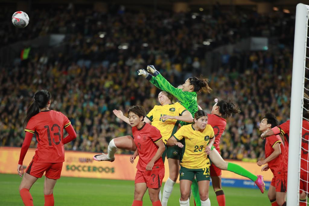 6月3日,在澳大利亞悉尼舉行的中澳女足友誼賽中,中國隊守門員徐歡(上)在比賽中撲救。新華社記者 馬平 攝