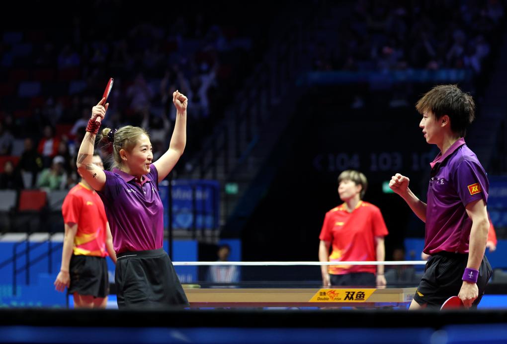 當(dāng)日,混雙比賽進行了半決賽,廣東隊林高遠(yuǎn)/劉詩雯和遼寧隊王藝迪/袁勵岑的混雙較量打滿7局。廣東隊先丟兩局,場面一度被動,但“詩與遠(yuǎn)方”組合憑借默契的配合將大比分打到3:3。決勝局,4:4、5:5、6:6,觀眾的加油聲不絕于耳,林高遠(yuǎn)和劉詩雯最終將比分鎖定在11:8,率先拿到?jīng)Q賽門票。