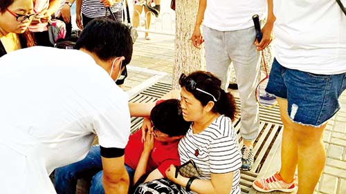 劉增芬大姐懷抱突發(fā)疾病的青年、 配合醫(yī)務(wù)人員進(jìn)行血壓心電圖檢測(cè)