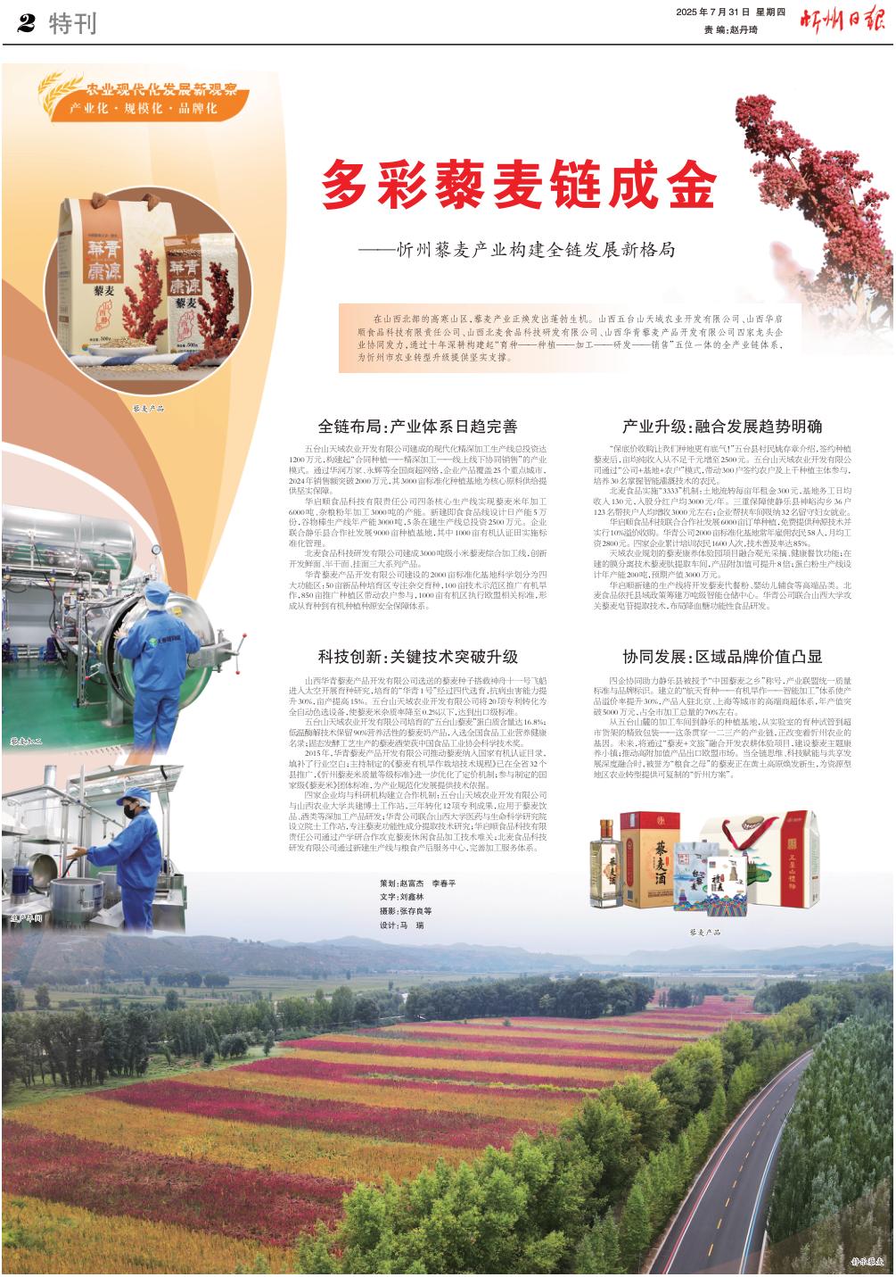從五臺(tái)山麓的加工車間到靜樂的種植基地,從實(shí)驗(yàn)室的育種試管到超市貨架的精致包裝——這條貫穿一二三產(chǎn)的產(chǎn)業(yè)鏈,正改變著忻州農(nóng)業(yè)的基因。未來,將通過“藜麥+文旅”融合開發(fā)農(nóng)耕體驗(yàn)項(xiàng)目,建設(shè)藜麥主題康養(yǎng)小鎮(zhèn);推動(dòng)高附加值產(chǎn)品出口歐盟市場(chǎng)。當(dāng)全鏈思維、科技賦能與共享發(fā)展深度融合時(shí),被譽(yù)為“糧食之母”的藜麥正在黃土高原煥發(fā)新生,為資源型地區(qū)農(nóng)業(yè)轉(zhuǎn)型提供可復(fù)制的“忻州方案”。