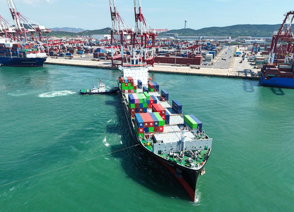 8月30日,“中外運(yùn)海口”輪緩緩駛離山東港口青島港(無(wú)人機(jī)照片)。今年以來(lái),山東港口青島港新增10條“一帶一路”航線(xiàn),“一帶一路”國(guó)家和地區(qū)箱量保持兩位數(shù)增長(zhǎng)。新華社發(fā)(張進(jìn)剛攝)