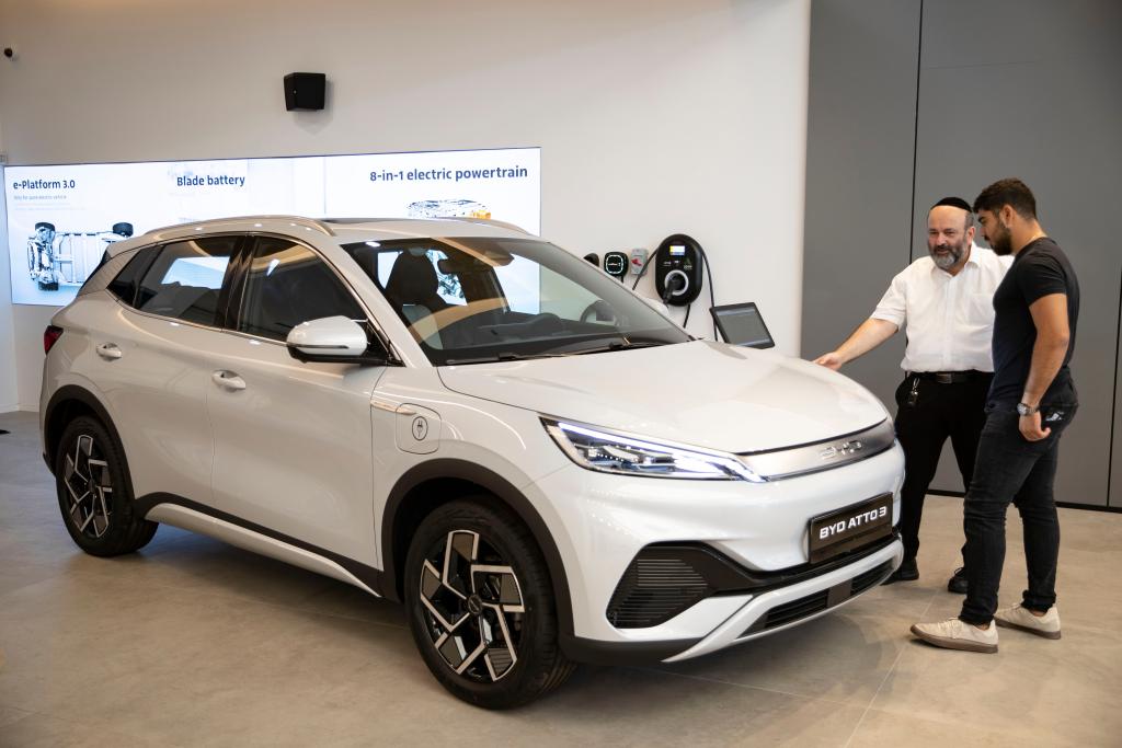 7月17日,在以色列特拉維夫一家比亞迪銷(xiāo)售點(diǎn),顧客咨詢(xún)SUV Atto 3電動(dòng)車(chē)。新華社記者陳君清攝