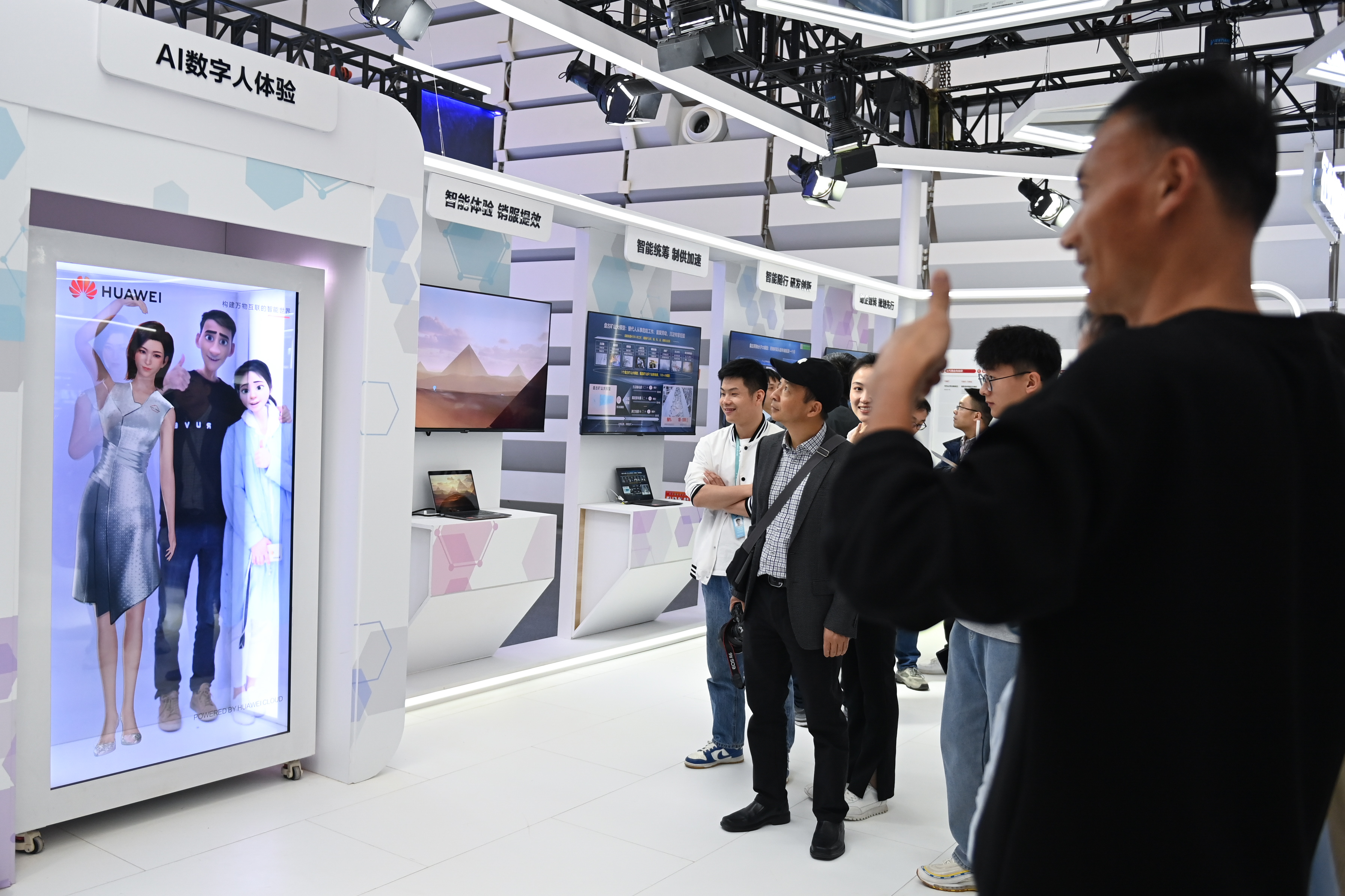 觀眾在華為展臺體驗與AI數(shù)字人合影。新華社記者 黃宗治 攝