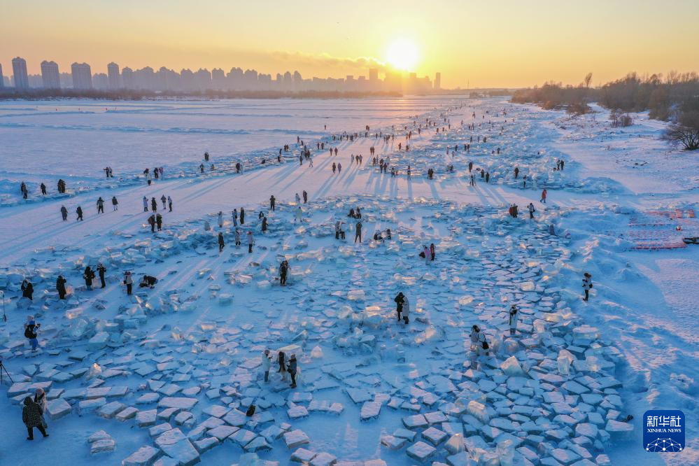 在封凍的松花江哈爾濱段,游客在日落時分的“鉆石?!庇瓮妫o人機(jī)照片,1月7日攝)。新華社記者 謝劍飛 攝