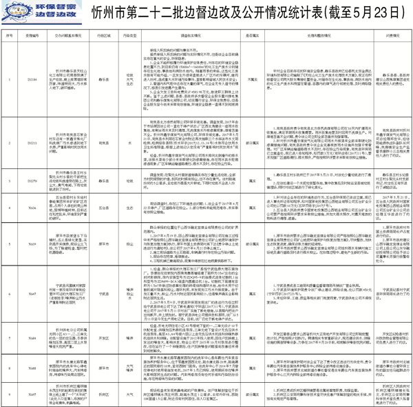 2017年5月20日晚,收到省群眾反映問題處置組督辦的第二十二批群眾反映問題共計(jì)9件;其中重點(diǎn)案件5件。另上報(bào)第二十一批未辦結(jié)問題1件,續(xù)報(bào)第十六批1件、第十九批1件、第二十批3件。 我市高度重視,立即組織查處,截至5月23日,督辦的15件群眾反映問題已辦結(jié)。其中,確認(rèn)屬實(shí)5件;部分屬實(shí)7件;不屬實(shí)3件。對于屬實(shí)和部分屬實(shí)已辦結(jié)的環(huán)保問題,分別采取了相應(yīng)處理措施,其中罰款18.045萬元,對20名相關(guān)責(zé)任人進(jìn)行了約談,對1名相關(guān)責(zé)任人進(jìn)行了黨紀(jì)政紀(jì)處分。對15件群眾反應(yīng)問題調(diào)查處理情況進(jìn)行了信息公開。