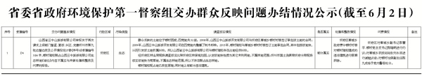 截止2017年6月3日10時,省委省政府環(huán)境保護(hù)第一督察組向我市交辦群眾反映問題六批,共計33件。其中,按重要性劃分,重點(diǎn)群眾反映問題11件、一般群眾反映問題22件;按區(qū)域分,忻府區(qū)14件、開發(fā)區(qū)1件、原平市3件、保德縣3件、寧武縣1件、五臺縣1件、河曲縣1件、定襄縣3件、岢嵐縣1件、代縣2件、靜樂1件、神池1件、市住建局1件;按污染類型分,大氣20件、水8件、垃圾6件、固廢1件、噪聲8件、生態(tài)3件、光1件、其他3件。目前已辦結(jié)第一批(1件)群眾反映問題,對3名相關(guān)責(zé)任人進(jìn)行了約談,對1名相關(guān)責(zé)任人進(jìn)行了黨紀(jì)政紀(jì)處分。