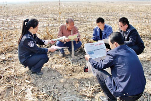 為了將《中華人民共和國大氣污染防治法》和《五臺縣人民政府嚴(yán)防森林火災(zāi)的通告》宣傳到戶、到人,五臺縣環(huán)保局組織工作人員,分組劃片深入到田間地頭,面對面讀報給農(nóng)民聽,為農(nóng)民解釋燒秸稈、燒荒等野外違規(guī)用火行為的危害。臺城鎮(zhèn)西關(guān)村66歲的農(nóng)民張存在說:“你們這樣解釋,咱懂。我家4畝地的秸稈保證不燒一根。”圖為五臺縣環(huán)保局工作人員在田間地頭宣傳環(huán)境保護相關(guān)知識。(金俊賢 辛宇 攝影報道)