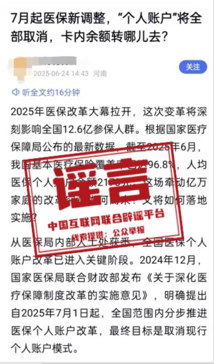 詳情:近日,一篇題為《7月起醫(yī)保新調整,“個人賬戶”將全部取消,卡內余額轉哪里去?》的自媒體文章引起較多關注。文中宣稱“從醫(yī)保局內部人士處獲悉,全國醫(yī)保個人賬戶改革已進入關鍵階段”“自2025年7月1日起,全國范圍內分步推進醫(yī)保個人賬戶改革,最終目標是取消現(xiàn)行個人賬戶模式”。