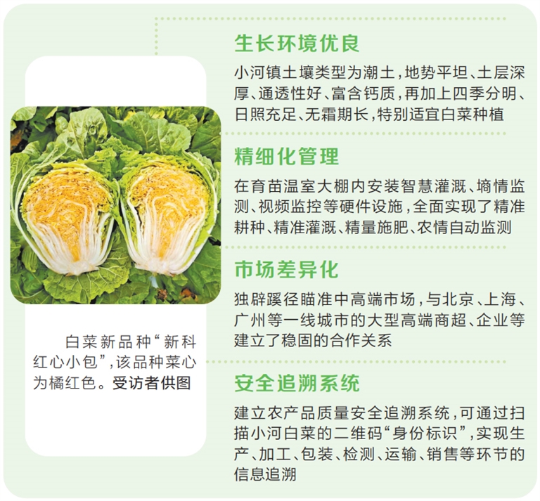“小河白菜跳出‘白菜價(jià)’,我們最大的底氣便是好的品種培育?!本G源農(nóng)牧總經(jīng)理張躍民介紹,他從2008年開始流轉(zhuǎn)600余畝土地規(guī)?;N植小河白菜,品種大部分來自新鄉(xiāng)市農(nóng)科院蔬菜研究團(tuán)隊(duì)。往年該公司主要種植的白菜品種為“新科小包26”,一棵也能賣到39元。