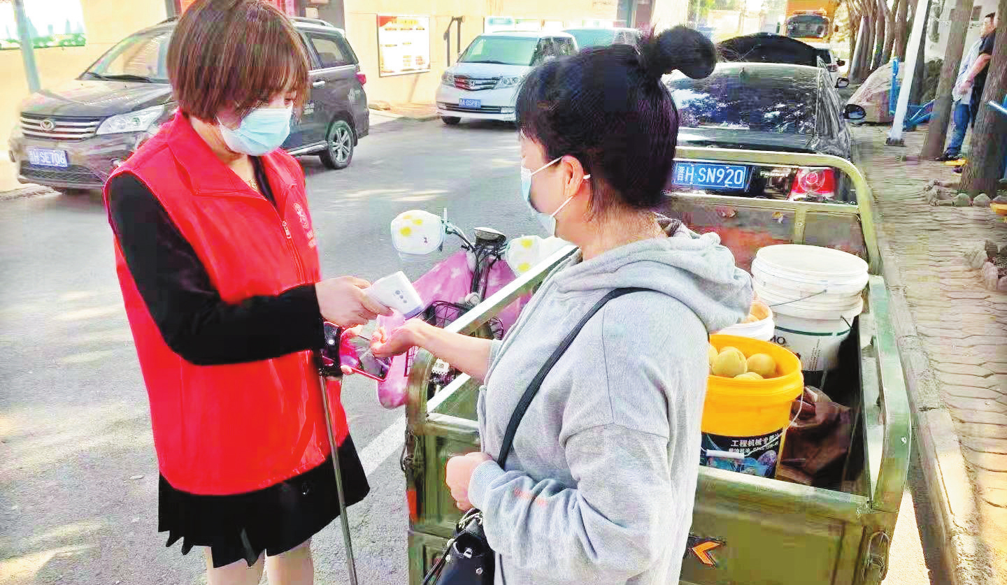 忻府區(qū)志愿者在橋西街巷為居民測體溫