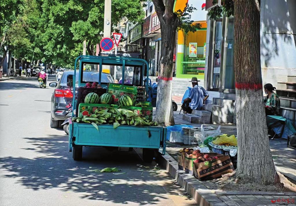 近日,記者在城區(qū)多條街巷發(fā)現(xiàn),大多數(shù)商販都能守法經(jīng)營(yíng),整齊有序擺放商品。然而,仍有個(gè)別商販占道經(jīng)營(yíng),對(duì)市容環(huán)境造成影響。圖為7月7日上午,城區(qū)氣象北巷一家蔬菜店把蔬菜擺放在門前的人行道上、把拉運(yùn)玉米的三輪車停放在馬路上叫賣,玉米皮隨地亂扔,嚴(yán)重妨礙了通行秩序。(記者張志遠(yuǎn)攝)