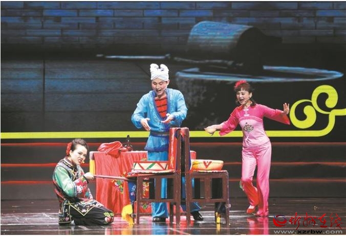 近日,“唱響黃河 再望西口”河曲民歌、二人臺(tái)專場節(jié)目展演在忻州大劇院精彩上演。圖為傳統(tǒng)二人臺(tái)小戲《壓糕面》表演。