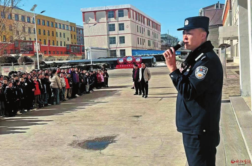 為進(jìn)一步提升鐵路沿線學(xué)生的安全意識(shí),近日,五寨火車站派出所深入管內(nèi)鐵路沿線五華里范圍內(nèi)學(xué)校開展法治安全宣傳教育,講解鐵路行車安全知識(shí),增強(qiáng)學(xué)生的自我防護(hù)能力。圖為民警在五寨縣第四小學(xué)開展安全教育宣傳。(索效光攝