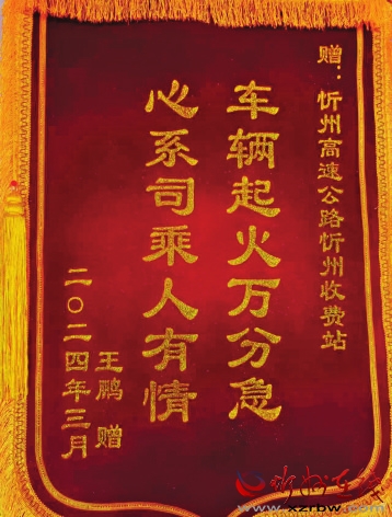 “嘀嘀,嘀嘀……”3月26日上午,一輛小型越野車行駛到忻州高速收費站出口時突然起火,滾滾黑煙迅速彌漫開來,情況十分危急。面對突如其來的險情,收費員賈金花臨危不亂,迅速拿起滅火器沖向火源。由于處置及時,火勢得到控制并最終被撲滅,車輛險情成功排除。事后為了表達感謝之情,司機特意給忻州高速收費站送去一面錦旗。