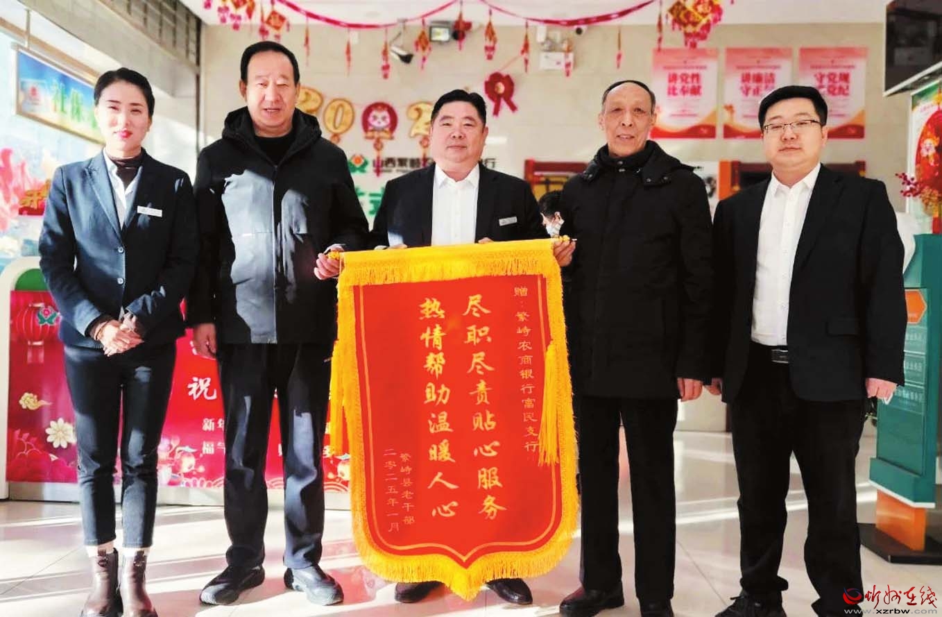 “咱農(nóng)商銀行的服務(wù)真是太好了!”近日,一位老干部將一面寫有“盡職盡責(zé)貼心服務(wù) 熱情幫助溫暖人心”的錦旗,送到了繁峙農(nóng)商銀行富民支行。在首季“開(kāi)門紅”期間,該行工作人員以專業(yè)的素養(yǎng)和熱情的態(tài)度,為客戶提供了暖心服務(wù),贏得了客戶的好評(píng),樹(shù)立了農(nóng)商行的良好社會(huì)形象。(郭凱文攝)