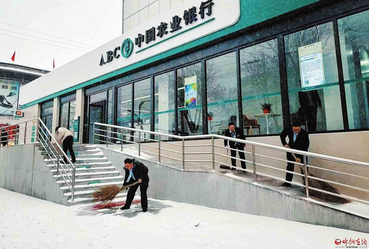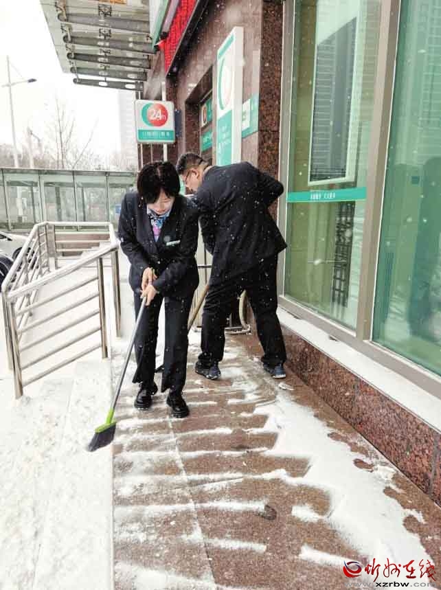 面對我市首場強降雪,農行忻州分行員工以雪為令,及時清掃網點及周邊區(qū)域,確保服務通道暢通無阻,以實際行動傳遞了溫暖的金融服務。(殷俊攝)