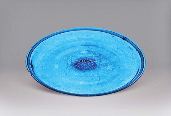 據(jù)地宮出土的物賬碑記載,整個(gè)地宮被布置得“窮天上之莊嚴(yán),極人間之煥麗”。在這些文物中,有六件來(lái)自阿拉伯國(guó)家的刻紋藍(lán)玻璃盤。玻璃盤保存完好,為無(wú)模吹制成形,通體藍(lán)色,晶瑩光潔,盤面刻滿紋飾,主體紋飾為以雙線勾勒出的十字形框架,盤心為正方形方框,方框外刻四個(gè)拱門形狀的尖瓣,與中心方框組成四個(gè)“米哈拉布”紋樣?!懊坠肌笔且了固m教清真寺大殿的禮拜龕,四個(gè)尖瓣內(nèi)各刻一朵五瓣葉子植物紋,尖瓣之間也飾以植物紋。制作工藝是在玻璃成器之后,用比玻璃更堅(jiān)硬的工具在其表面淺刻花紋,加以描金,從而使得玻璃盤更為華麗。