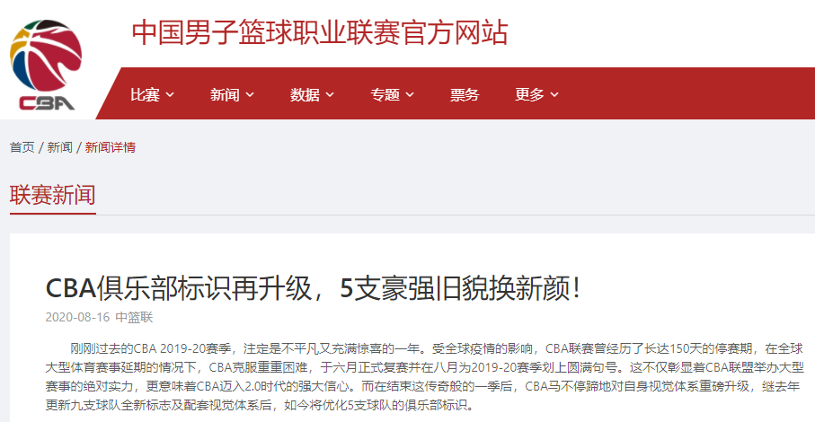 人民網(wǎng)北京8月17日電(楊喬棟)剛剛過(guò)去的CBA 2019-20賽季,注定是不平凡又充滿驚喜的一年。16日,CBA公司發(fā)布公告稱,本著對(duì)CBA聯(lián)盟視覺(jué)體驗(yàn)不斷升級(jí)的宗旨,CBA聯(lián)盟對(duì)遼寧(飛豹)、吉林(東北虎)、新疆(飛虎)、廣廈(猛獅)、福建(鱘魚)5支球隊(duì)優(yōu)化升級(jí)俱樂(lè)部標(biāo)識(shí)。優(yōu)化后的新標(biāo)識(shí)將于2020-21賽季開始正式使用。這也是繼去年更新九支球隊(duì)全新標(biāo)識(shí)及配套視覺(jué)體系后,新添加的五支更換俱樂(lè)部標(biāo)識(shí)的球隊(duì)。