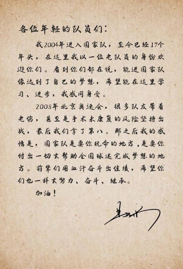 易建聯(lián)在信中回顧了自己首次入選國(guó)家隊(duì)的感受,表示自己完全能理解新隊(duì)員此刻的心情,他尤其強(qiáng)調(diào)了榮譽(yù)感與責(zé)任感,對(duì)這些小兄弟們說(shuō)“國(guó)家隊(duì)是要你玩命的地方”,“各位年輕隊(duì)員們,我2004年進(jìn)入國(guó)家隊(duì),至今已經(jīng)有17個(gè)年頭,在這里我以一位老隊(duì)員的身份歡迎你們。看到你們都在說(shuō),能進(jìn)國(guó)家隊(duì)像達(dá)到了自己的夢(mèng)想,希望能在這里學(xué)習(xí)、進(jìn)步,我感同身受。2008年北京奧運(yùn)會(huì),很多隊(duì)友帶著老傷,甚至是手術(shù)未康復(fù)的風(fēng)險(xiǎn)堅(jiān)持出戰(zhàn),最后我們拿到了第八。那之后我的感悟是,國(guó)家隊(duì)是要你玩命的地方,是要你付出一切去幫助全國(guó)球迷完成夢(mèng)想的地方。前輩們用血汗奮斗出佳績(jī),希望你們也一樣去努力、奮斗、繼承?!?/span>