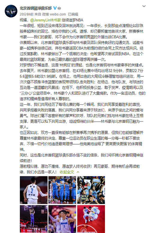 林書豪個人社交平臺視頻截圖 人民網(wǎng)北京9月15日電(楊喬棟)15日,林書豪通過個人社交平臺發(fā)布自制視頻宣布,下個賽季將不再代表北京首鋼男籃征戰(zhàn)CBA賽場,而將繼續(xù)尋求征戰(zhàn)美國職業(yè)籃球聯(lián)賽的機(jī)會。林書豪在視頻中稱,最近四周都在思考下一步的規(guī)劃,但是最終還是忍痛做了一個艱難的決定——暫時告別CBA,“我決定今年(下個賽季)不回首鋼去打球,這個決定是我人生最難的一個決定?!彪S后,北京首鋼男籃通過官方微博發(fā)布長文,在確認(rèn)林書豪“離開”的同時也第一時間為其送上祝福。北京男籃官宣全文如下: 一年很短,短到還沒來得及回味就說再見;一年很長,長到那些點(diǎn)滴相處如珍珠般串起綿長的回憶,烙在你我的心間。遺憾,卻仍要鄭重地告訴大家,新賽季林書豪——我們的豪哥,將不會作為北京首鋼男籃的外援出戰(zhàn)CBA比賽。 休賽期以來,北京首鋼籃球俱樂部與林書豪及團(tuán)隊(duì)保持良好的溝通交流,誠邀書豪一起攜手繼續(xù)征戰(zhàn),并在書豪返回CBA為前提的續(xù)約合同上雙方達(dá)成共識。經(jīng)過反復(fù)斟酌,林書豪做出了一個艱難的決定:他希望再次嘗試回到NBA,在這個最高的籃球殿堂,為自己最執(zhí)著的籃球理想再拼搏一次。 對夢想的不懈追逐,這是“林瘋狂”的源起,也是北京首鋼與林書豪牽手的關(guān)鍵點(diǎn)。去年夏天,林書豪加盟北京首鋼,在43場比賽中場均出場32.9分鐘,貢獻(xiàn)22.7分5.6籃板5.6助攻1.9搶斷。在場上,他用出色的大局觀冷靜理智地組織進(jìn)攻,用一次次奮不顧身沖擊籃筐的表現(xiàn)帶領(lǐng)球隊(duì)走向勝利;在場邊,他與隊(duì)友、與球迷的互動是一道溫馨的風(fēng)景線;在場下,他積極投身公益,敢于發(fā)聲,疫情期間以及“三分心”公益項(xiàng)目中,林書豪個人和團(tuán)隊(duì)進(jìn)行了大量捐款。作為一名運(yùn)動員,他的追求和精神是值得所有人尊敬的。 這一年,我們共同經(jīng)歷了每場比賽的每一個瞬間,我們共同享受著勝利的喜悅,共同承擔(dān)著失敗的落寞,我們共同分享著來源于球迷們,來源于彼此之間的愛與勇氣。球迷們毫不吝嗇所有的掌聲和歡呼,球隊(duì)的兄弟們既與林書豪在場上互相支撐,更是可以私下共同出游、坦誠相待的伙伴——林書豪與北京首鋼已融為一家人。 也正因如此,雙方一直保有能夠在新賽季再次攜手的愿景,但我們也能夠理解并尊重林書豪最終的決定,尊重一位運(yùn)動員在職業(yè)生涯的每一分每一秒都不曾放棄,不惜一切代價(jià)地追逐最高理想——他完美地詮釋了“更高更快更強(qiáng)”的體育精神。 同時,這也是北京首鋼籃球俱樂部永恒不變的信條,我們將懷揣北京首鋼精神繼續(xù)前進(jìn)! 愿前程似錦,愿功不唐捐,愿追夢人終將收獲!再見豪哥,期待有機(jī)會再續(xù)前緣,我們永遠(yuǎn)是一家人!