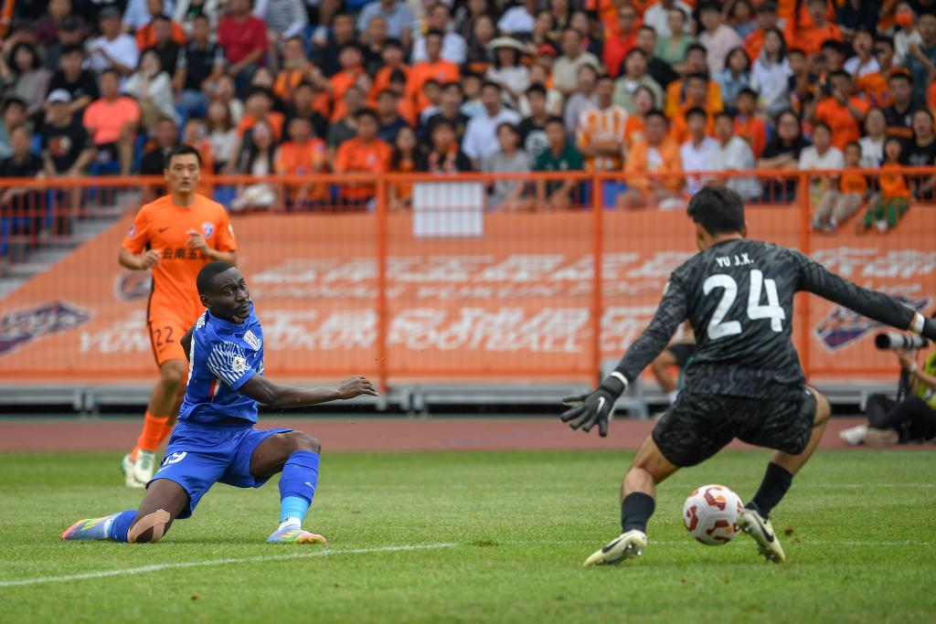 8月2日,上海申花隊(duì)球員阿蘇埃(前左)在比賽中射門。新華社記者 彭奕凱 攝