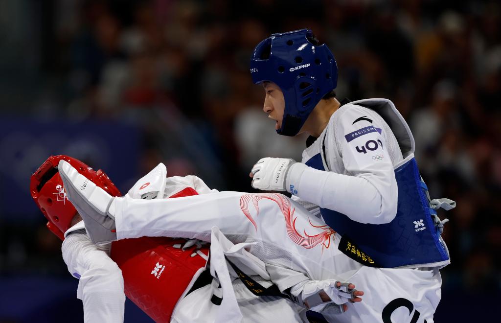2024年8月8日,中國選手梁育帥(右)在巴黎奧運會跆拳道男子68公斤級16強(qiáng)賽上。新華社記者 費茂華 攝