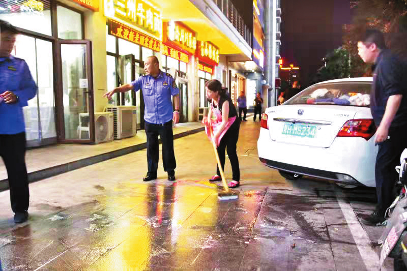 據(jù)了解,此次行動共出動執(zhí)法人員近30名。通過專項整治,進(jìn)一步規(guī)范了城區(qū)商鋪的經(jīng)營秩序,提升了居民的環(huán)保意識和文明意識,營造了和諧文明的市容環(huán)境。圖為執(zhí)法人員與商家一同清理店鋪門前油污。(記者張志遠(yuǎn) 攝影報道)