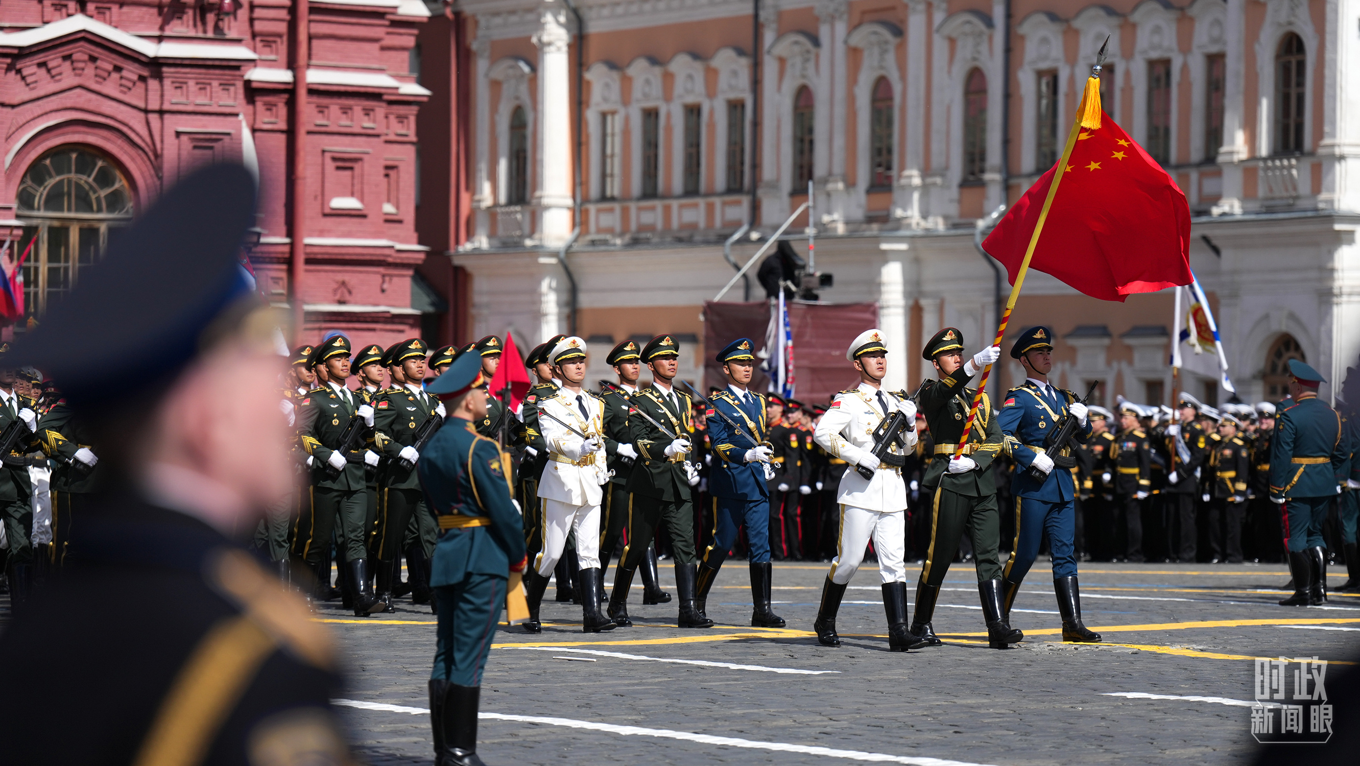 △中國人民解放軍三軍儀仗隊方隊軍容嚴(yán)整、士氣高昂,邁著堅定有力的步伐走過紅場。(總臺記者李晉拍攝)