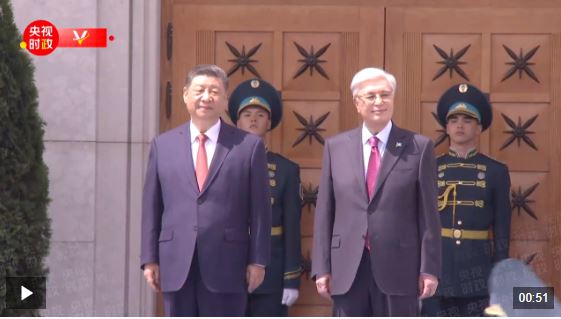 習(xí)近平抵達(dá)阿斯塔納納扎爾巴耶夫國(guó)際機(jī)場(chǎng)時(shí),托卡耶夫總統(tǒng)率總統(tǒng)辦公廳主任達(dá)杰拜、副總理兼外長(zhǎng)努爾特列烏、總統(tǒng)外事顧問卡濟(jì)漢、阿斯塔納市長(zhǎng)卡瑟姆別克等高級(jí)官員熱情迎接。身著盛裝的哈薩克斯坦女青年向習(xí)近平獻(xiàn)花。禮兵分列藍(lán)地毯兩側(cè)致敬,哈薩克斯坦少年兒童手持中哈兩國(guó)國(guó)旗熱烈歡迎習(xí)近平到訪。習(xí)近平在托卡耶夫陪同下觀看儀仗隊(duì)分列式,直升機(jī)懸掛中哈國(guó)旗從機(jī)場(chǎng)上空飛過。在機(jī)場(chǎng)貴賓樓內(nèi),兩國(guó)元首還共同欣賞哈薩克斯坦少年兒童的文藝表演。