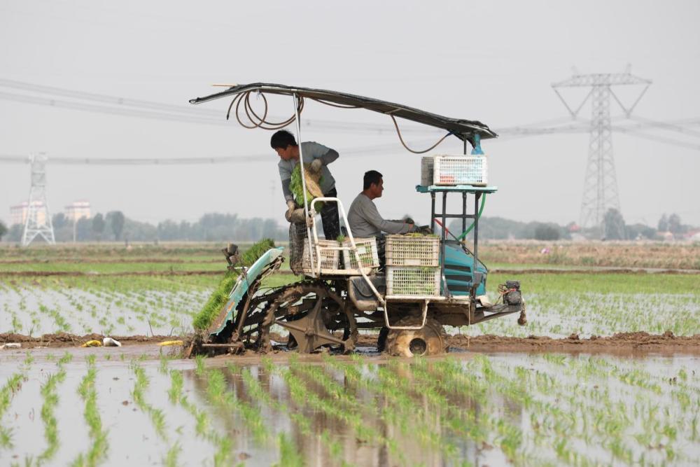 △2025年5月,農(nóng)民在河北滄縣南堤村的鹽堿稻田進(jìn)行插秧作業(yè)。