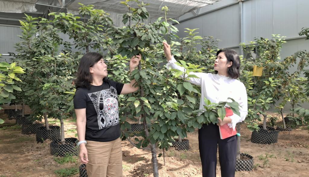 新路村黨支部書記、村委會主任劉翠萍與“櫻桃樹下”種植園有關(guān)負(fù)責(zé)人察看櫻桃長勢。張林泉 攝