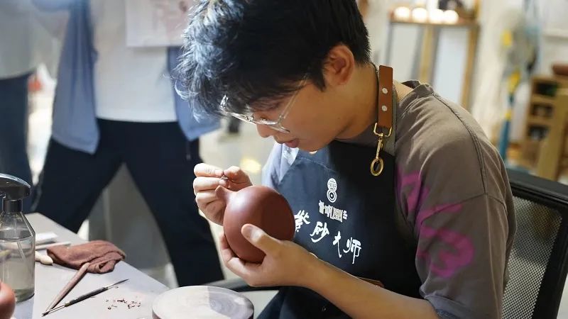 在砂器(紫砂)文化示范區(qū)的山西晉明堂文化科技有限公司(以下簡稱晉明堂),一位年輕人正熟練地運用各種工具給手里的紫砂壺進(jìn)行壺嘴部分的制作。他叫穆清,今年剛20歲出頭的他,耳濡目染父親對紫砂文化的熱愛,也對這一行業(yè)產(chǎn)生了濃厚的興趣,決心將平定紫砂文化傳承發(fā)揚下去。