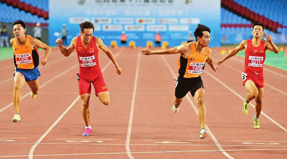 8月16日晚,省第十六屆運(yùn)動會田徑比賽男子甲組百米對決中,長治市運(yùn)動員王隆以10秒62的成績奪得冠軍。本報(bào)記者劉通 本報(bào)通訊員王中勛攝