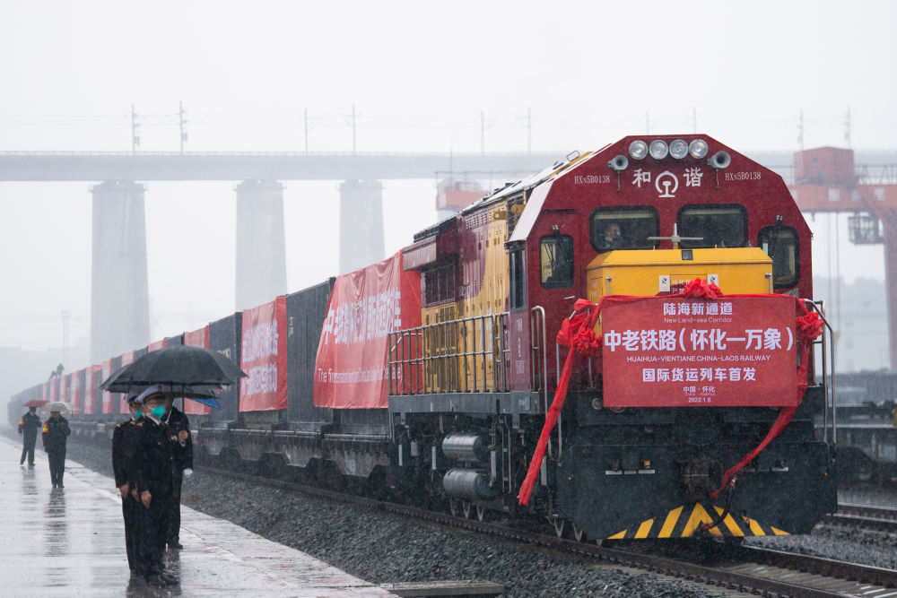 開往老撾萬象的中老鐵路(懷化—萬象)國際貨運(yùn)列車在湖南懷化國際陸港準(zhǔn)備發(fā)車(2023年1月6日攝)。新華社記者 陳思汗 攝