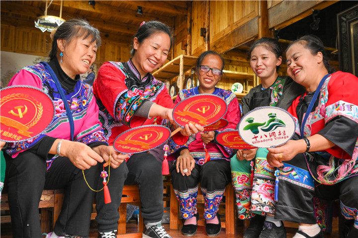 在湖南省湘西土家族苗族自治州花垣縣雙龍鎮(zhèn)十八洞村,村里的婦女在學習繡制“十八洞村”苗繡文創(chuàng)產品。郭立亮 攝